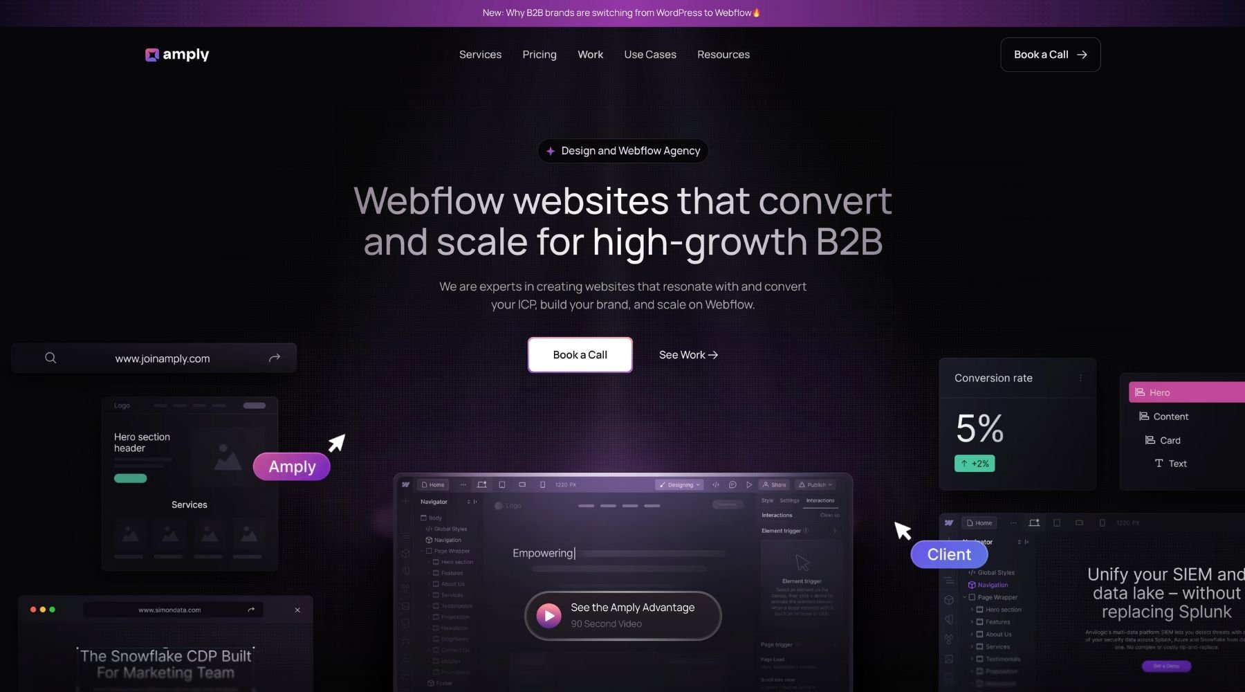 Amply builds Webflow websites that balance visual appeal with conversion and SEO optimisation. Their client roster includes impressive names like Snowflake, Zeni, and Bounty, demonstrating their understanding of fast-moving tech and SaaS environments.