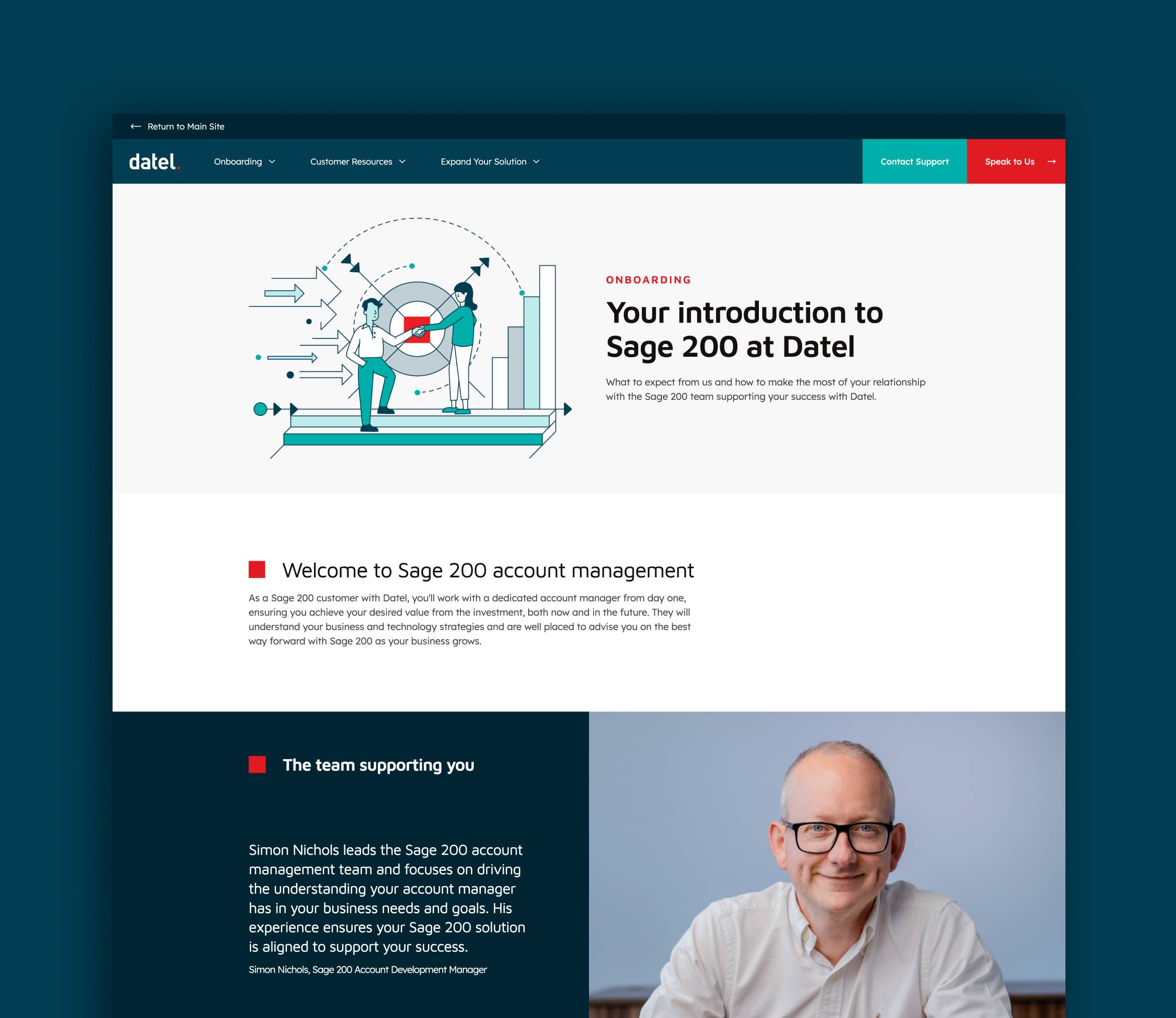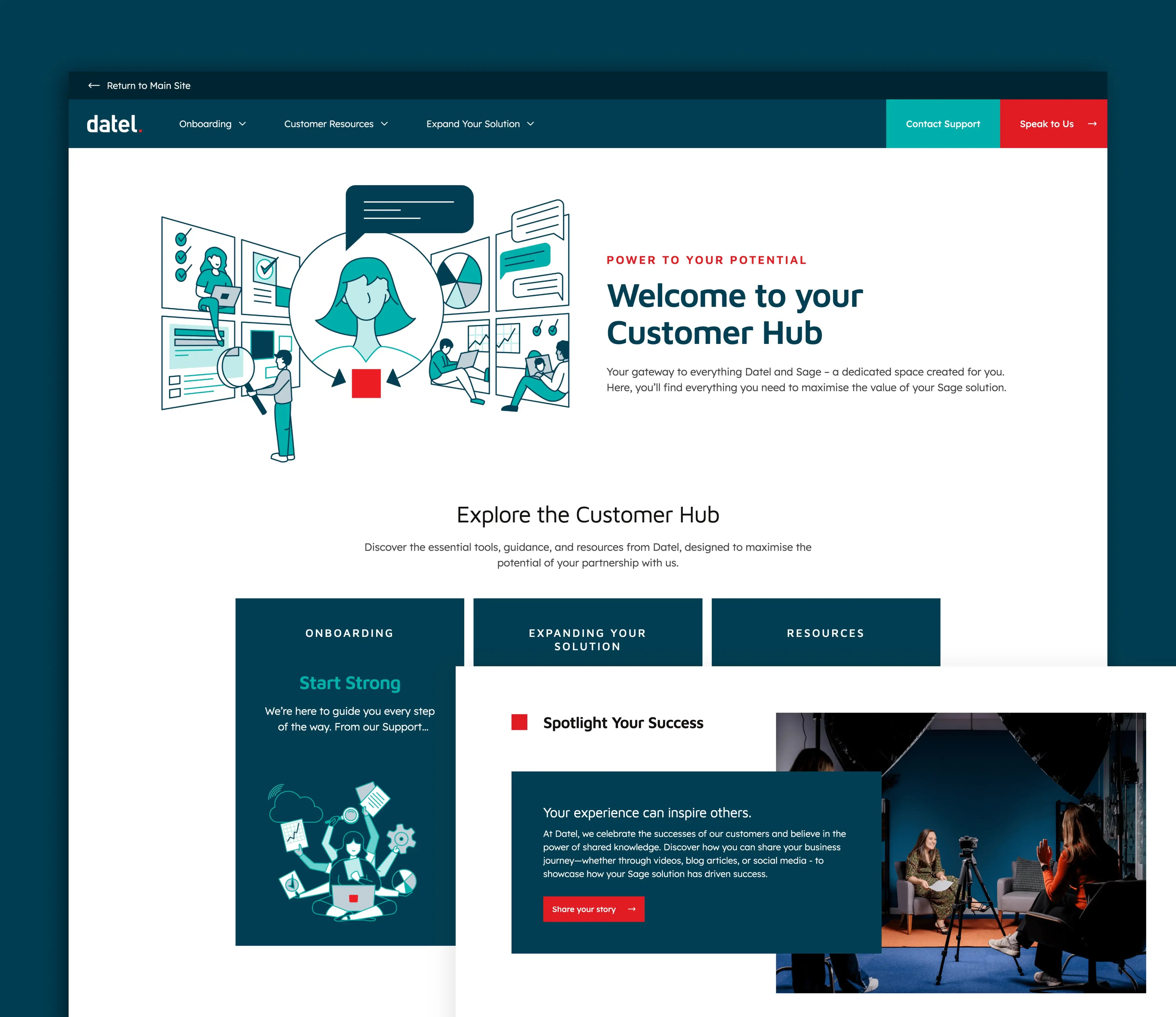 Recognising that 50% of their customers stay with them for five years or more, Datel needed a dual-website approach. The main site focuses on attracting new prospects, while a dedicated customer microsite provides a VIP experience for existing clients, using a darker brand treatment to create a premium feeling space.