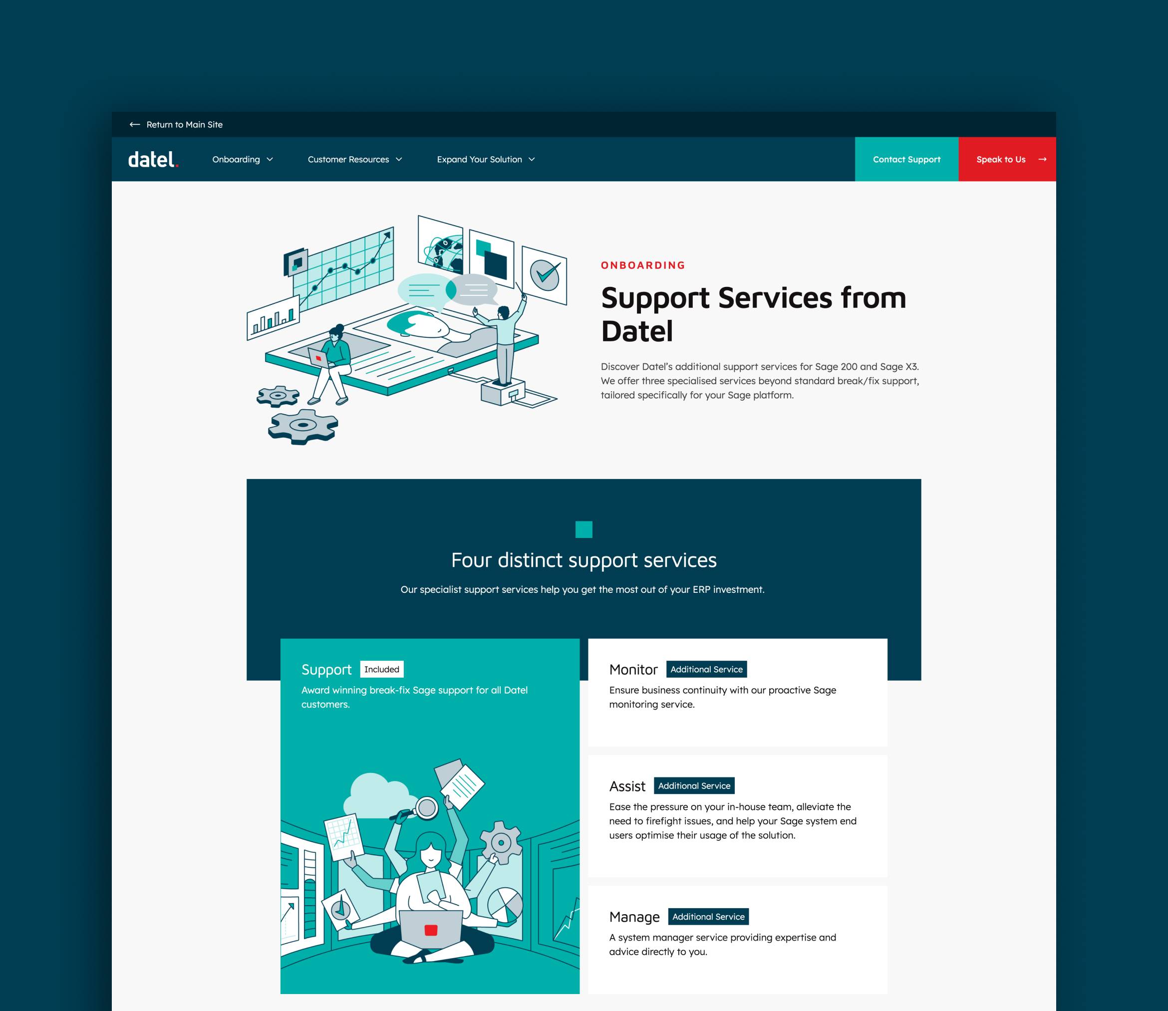 For the customer microsite, we extended this approach by creating new illustrations tailored to customer-specific themes. Areas like onboarding, customer resources, product introductions, and service add-ons are all visually supported by bespoke artwork that reflects the real-world journey of Datel’s customers. This visual consistency helps strengthen the experience while keeping it warm, human, and aligned with the brand.