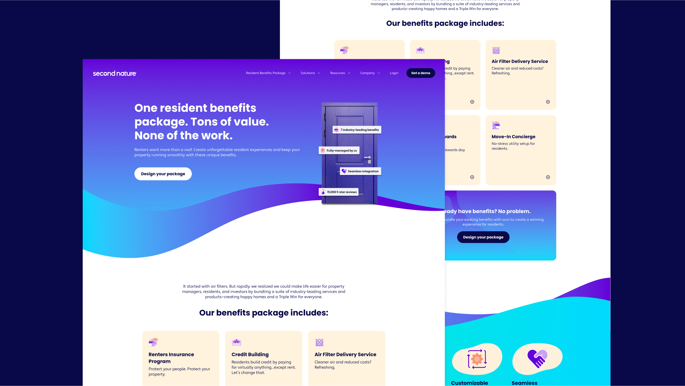 Second Nature is a US-based company focused on redefining professional property management through their innovative Resident Benefits Packages (RBP). They already had an existing website, but it was shared with their FilterEasy brand. After seeing significant expansion of their RBP platform, the offering warranted its own dedicated presence. So, Second Nature approached Blend to create a website focused solely on showcasing the unique capabilities of their RBP service.
