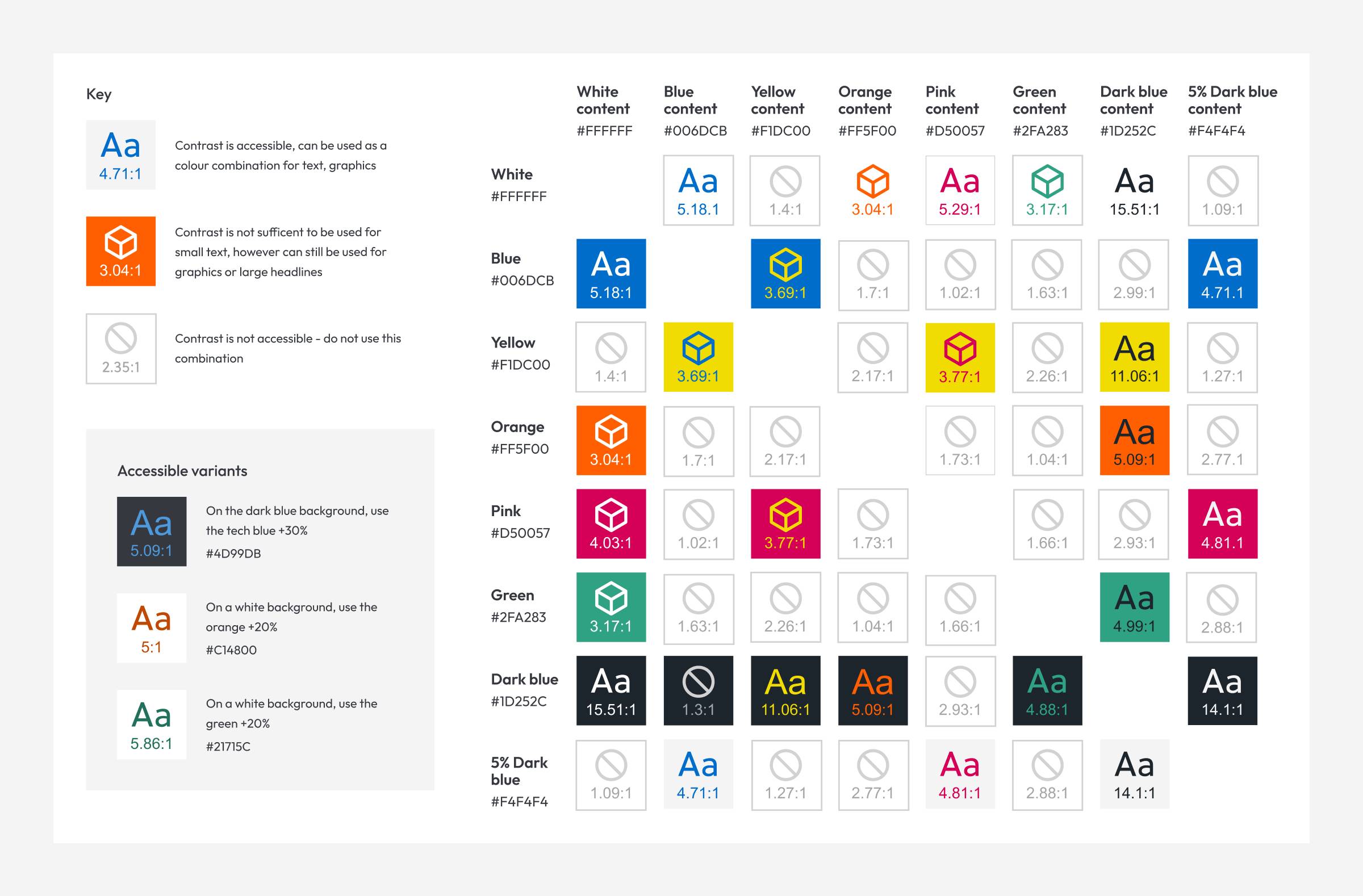 We supplied Wavenet with a digital accessibility matrix, offering clarity on colour combinations with AA-level contrast, to ensure optimal accessibility for all users. This matrix clearly sets out: